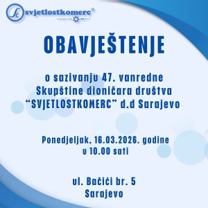 Saziva se 47. vanredna Skupština dioničara društva ˝SVJETLOSTKOMERC˝ d.d. Sarajevo, koja će se održati dana 16.03.2026. godine (ponedjeljak) u prostorijama društva „SVJETLOSTKOMERC“ d.d. Sarajevo ul.